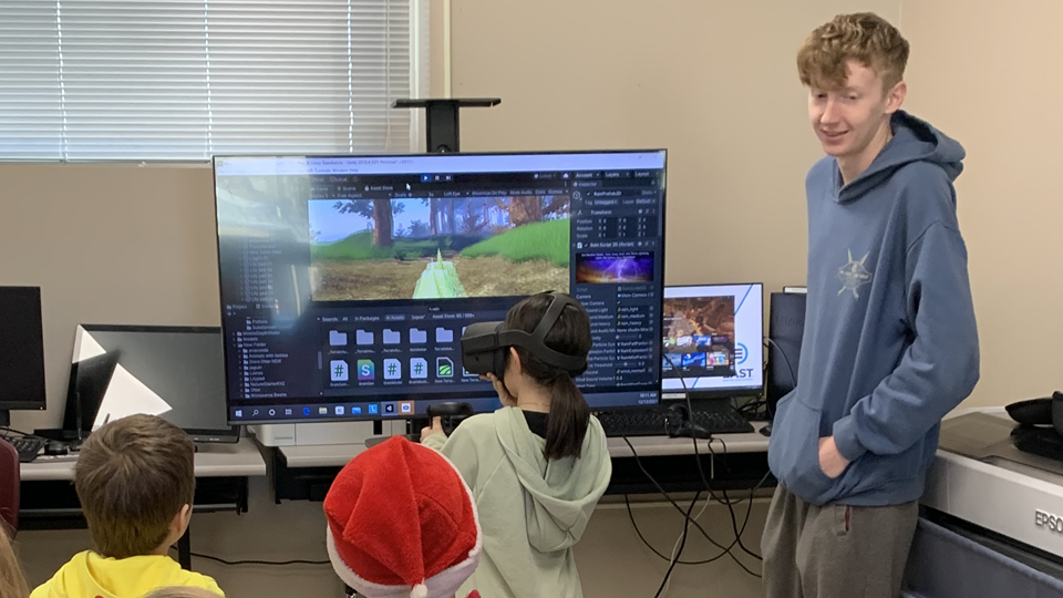 Hayden’s idea of developing a video game caught the attention of his classmate Shannon Griffin, who proposed combining Hayden’s love of game development, her own love of environmental science, and their partner Rebecca Shipley’s love of working with children into creating an educational VR game for elementary school students.