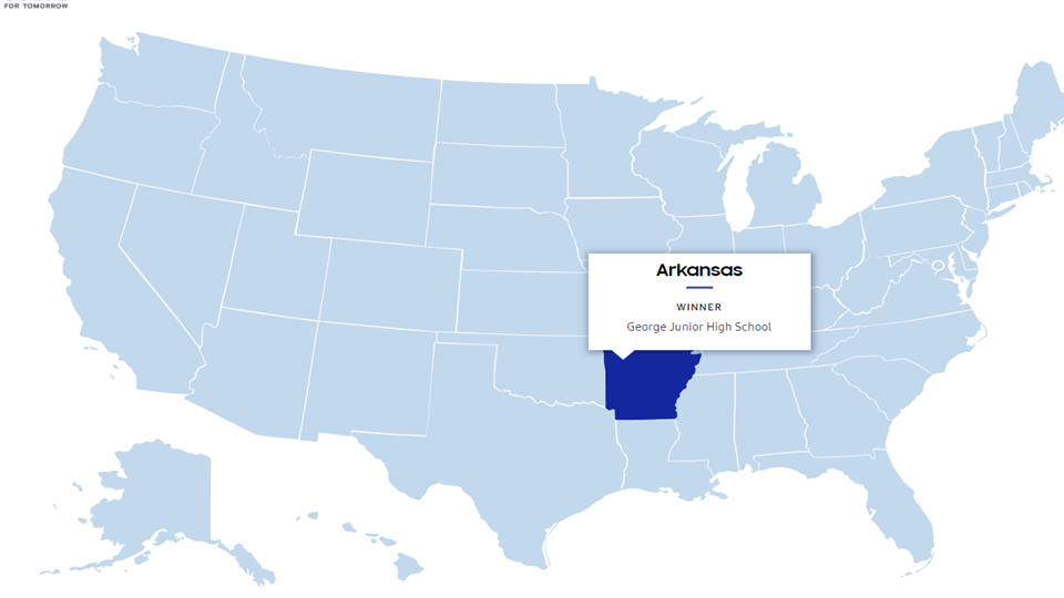George Junior High is among the nation’s 50 state winners (representing all 50 states) and will receive $20,000* in technology for its achievement. The school will also receive a Samsung video kit to create and submit a three-minute video showcasing their project development and how it addresses the issue in hopes of advancing to the next phase of the contest and win additional prizes and educational opportunities. “The scale and importance of the issues addressed in this year’s contest reflect how students are taking responsibility for their role as change agents for the future,” said Ann Woo, senior director of corporate citizenship, Samsung Electronics America. “These state winners and trailblazing teachers and students are taking action to create tangible solutions and promote positive change. Samsung is proud to support their vision for a brighter future and looks forward to seeing how they will use imagination and creativity with complex technologies such as VR and 3D printing to bring these projects to life.”